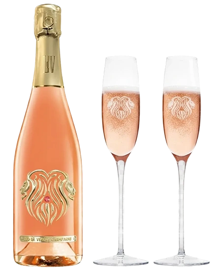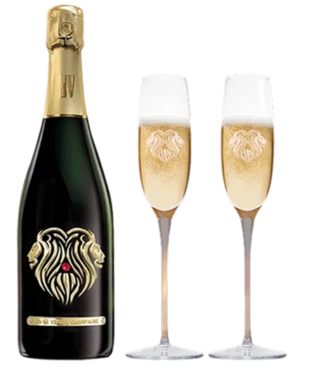 One bottle of Reign Brut and one bottle of Reine Rosé, each featuring the iconic LDV lion emblem adorned with a genuine Swarovski crystal